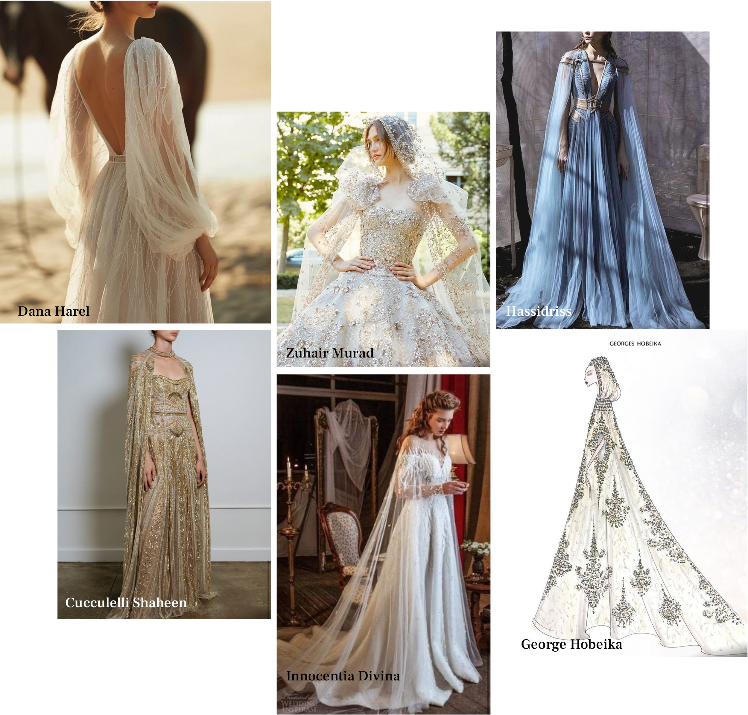 בתהליך העיצוב נפרדנו מרעיון של הינומת כיפה או גלימה. נשארנו עם שובל ארוך ומרשים במיוחד ושרוולים נפוחים שניתן לנתק ולחבר, ומחוך ללא קאפים שנותן לשמלה לוק שיריוני. הפרט האהוב על אופל בשמלה היה מחשוף מרובע עם פינות מעוגלות ושפיץ קטן במרכזו. י